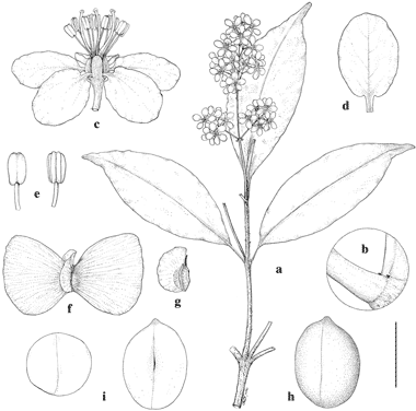 Psychopterys rivularis. a. Flowering branch. b. Base of petiole to show stipules. c. Flower. d. Petal laid flat. e. Anthers, abaxial view (left) and adaxial view (right). f. Samara, abaxial view. g. Nut of samara with lateral wings cut away, lateral view to show dorsal wing. h. Intact embryo. i. Enbryos in cross-section (left) and longitudinal section (right). Scale bar equivalents: a, 4 cm; b, 4 mm; c, 5 mm; d, 4 mm; e, 2 mm, f, g, 2 cm; h, i, 5 mm. Based on: a–e, Sinaca C. 57, WIS; f, g, Ibarra M. 603, MICH; h, i, Ibarra M. 3388, TEX. Drawn by Karin Douthit. First published in Contr. Univ. Michigan Herb. 25: 133. 2007; reproduced with permission of the authors.