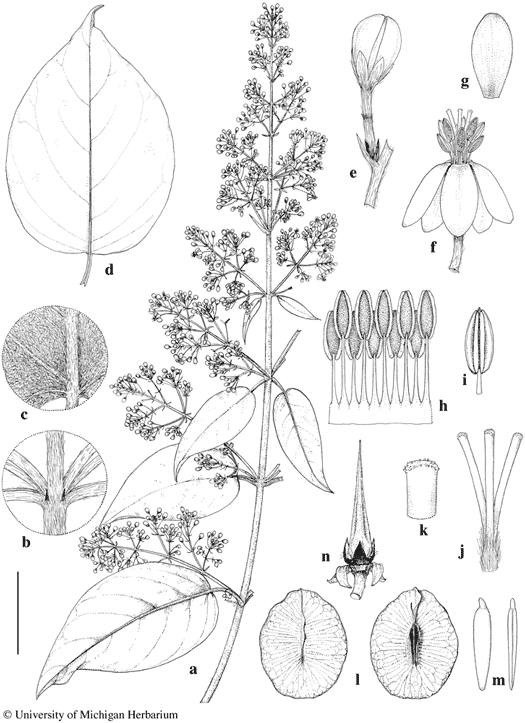 Scale bar equivalents: a, 4 cm; b, 8 mm; c, 4 mm; d, 4 cm; e–g, 4 mm; h, 2 mm; i, 1.5 mm; j, 2 mm; k, 0.7 mm; l, 2 cm; m, 8 mm; n, 4 mm. Based on: a–c, e–k, Kaul s.n., MO; d, Singh 387, NY; l–n, Raizada s.n., NY. Drawn by Karin Douthit. © University of Michigan Herbarium.