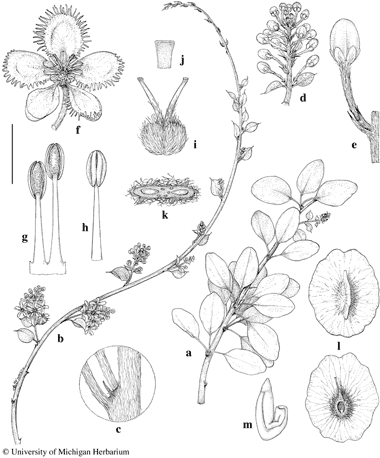 Diaspis albida. a. Leafy branch. b. Flowering branch. c. Node with stipule beside petiole. d. Inflorescence. e. Flower bud. f. Flower, posterior petal uppermost. g. Stamens opposite petal (left) and opposite sepal (right), abaxial view. h. Stamen, adaxial view. i. Gynoecium. j. Apex of style. k. Cross-section of ovary. l. Samaras, abaxial view (above) and adaxial view (below). m. Embryo. Scale bar equivalents: a, b, 4 cm; c, 4 mm; d, 1.3 cm; e, 4.5 mm; f, 5 mm; g–i, 2 mm; j, 0.7 mm; k, 1.6 mm; l, 1 cm; m, 4 mm. Based on: a–e, Robertson 5045, MO; f–k, Faden & Faden 74/517, MO; l, m, De Wilde 5920, MO. Drawn by Karin Douthit. © University of Michigan Herbarium.