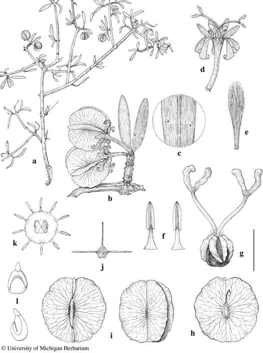 Scale bar equivalents: a, 4 cm; b, 8 mm; c, 2.7 mm; d, 4 mm; e, 2 mm; f, 1 mm; g, 1.3 mm; h–j, 1 cm; k, 3 mm; l, 4 mm. Based on: a–g, Bosser 166, MO; h–k, Humbert & Swingle 5368, MO; l, Decary 9470, MO. Drawn by Karin Douthit. © University of Michigan Herbarium.