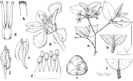 Malpighia emiliae and M. diversifolia. a–i, M. emiliae. a. Flowering branch. b. Abaxial surface of lamina, with enlarged hairs adjacent. c. Adaxial surface of lamina, with enlarged hairs adjacent. d. Flower, lateral view, posterior petal uppermost and turned to show its abaxial side. e. Lateral petal, lateral view. f. Partial androecium laid out, abaxial view, the stamen at left opposite posterior petal. g. Gynoecium, anterior style in middle. h. Apex of style. i. Fruit, viewed from above. j, M. diversifolia. Lateral petal, lateral view. Scale bar equivalents: a, 4 cm; b, c, 8 mm (1.3 mm); d, 5.7 mm; e, 5 mm; f, g, 2.7 mm; h, 0.8 mm; i, 1.3 cm; j, 5 mm. Based on: a–h, Lott 1658, MICH; i, Lott et al. 1683, MICH; j, Brandegee s.n. [UC 187362], UC. Drawn by Karin Douthit. First published by W. R. Anderson in Contr. Univ. Michigan Herb. 16: 91. 1987.