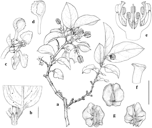 Malpighia leticiana. a. Branches with immature fruits. b. Node and abaxial leaf base, with one needle-like hair enlarged to right. c. Flower, lateral view, posterior petal uppermost. d. Posterior petal. e. Androecium and gynoecium, with anterior style in center and anthers removed from three posterior stamens. f. Apex of style. g. Three views of immature mericarps, one adaxial (above) and two abaxial (below). Scale bar equivalents: a, 4 cm; b, 8 mm (4 mm); c, 8 mm; d, 5 mm; e, 3.3 mm; f, 1 mm; g, 1.3 cm. Based on Torres C. 629, MICH. Drawn by Karin Douthit. First published by W. R. Anderson in Contr. Univ. Michigan Herb. 17: 49. 1990, as Mascagnia leticiana.