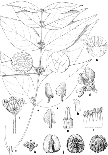 Scale bar equivalents: a, 4 cm (0.8 mm); b, 4 mm; c, 8 mm; d, 6.7 mm; e, 5 mm; f, g, 3.3 mm; h, 2 mm; i–k, 1.3 cm. Based on: a–h, Rzedowski & McVaugh 1409, MICH; i–k, McVaugh 16037, MICH. Drawn by Karin Douthit. First published by W. R. Anderson in Contr. Univ. Michigan Herb. 16: 96. 1987.