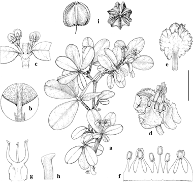 Malpighia stevensii. a. Flowering branch. b. Base of leaf, abaxial view, and stipules. c. Axillary two-flowered umbels. d. Flower, lateral view, posterior petal to left. e. Posterior petal, flattened. f. Androecium laid flat, abaxial view, the stamen to left opposite posterior petal. g. Gynoecium, anterior style in middle. h. Distal portion of style. i. Dried fruits, lateral view (left) and from above (right). Scale bar equivalents: a, 4 cm; b, 6.7 mm, c, 2 cm; d, e, 6.7 mm; f, g, 4 mm; h, 1 mm; i, 2 cm. Based on: a, Stevens 14675, MICH; b–h, Stevens 22927, MICH; i, Stevens 9123, MICH. Drawn by Karin Douthit. First published by W. R. Anderson in Contr. Univ. Michigan Herb. 16: 97. 1987; reproduced with the author's permission.