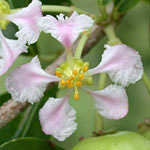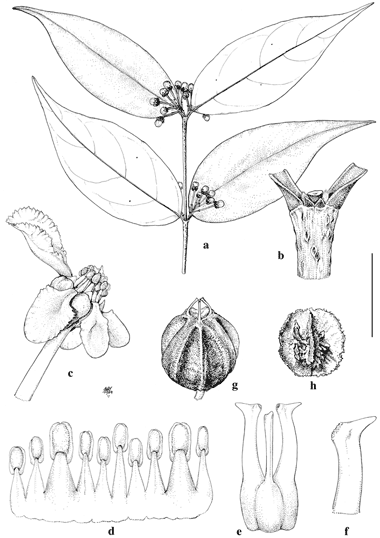 Malpighia wendtii. a. Flowering stem. b. Node showing interpetiolar stipules and lenticels. c. Flower, lateral view, posterior petal erect. d. Androecium laid out, abaxial view, the stamen at left opposite posterior petal. e. Gynoecium, anterior style in middle. f. Distal portion of lateral style. g. Fruit, dried but intact. h. One pyrene of fruit with flesh removed, abaxial view. Scale bar equivalents: a, 4 cm; b, 4 mm; c, 5.7 mm; d, 3 mm; e, 2.7 mm; f, 1.6 mm; g, h, 1.6 cm. Based on: a, c–f, Wendt et al. 2825, MICH; b, g, h, Contreras 7823, MICH. Drawn by Karin Douthit. First published by W. R. Anderson in Contr. Univ. Michigan Herb. 16: 101. 1987; reproduced with the author's permission.