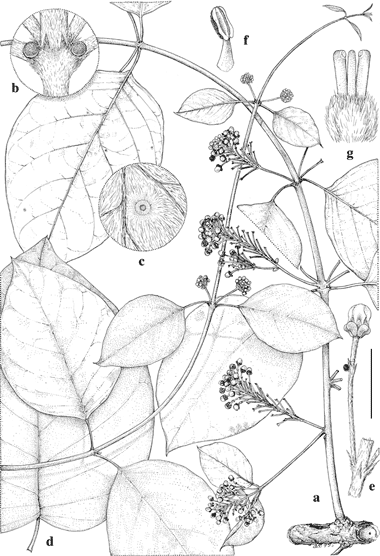 Scale bar equivalents: a, 4 cm; b, 5 mm; c, 4 mm; d, 4 cm; e, 8 mm; f, g, 2.7 mm. Based on CerĂ³n M. & Iguago 5475, MICH. Drawn by Karin Douthit. First published by W. R. Anderson & C. C. Davis in Contr. Univ. Michigan Herb. 24: 36. 2005.