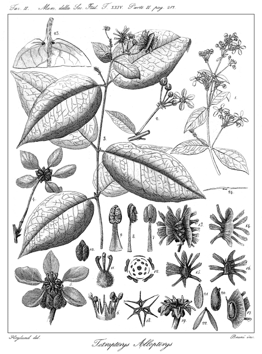 1. Flowering branch. 2. Flowering axillary branch; stipules inserted on stem below base of petioles. 3. Fruiting branch. 4. Floriferous, bracteolate peduncle in the axil of a bract. 5. Flower. 6. Stamens, with the filaments connate into a ring at base. 7, 8, and 9. Stamens in abaxial view, lateral view, and adaxial view. 10. Dorsal connective exceeding the locules of the anther [That may be an error on the part of Moris; that drawing looks like an abaxial view of a sepal bearing two glands. WRA]. 11. Very hairy ovary and styles. 12. Floral diagram. 13. Peduncle bearing a [complete] fruit. 14, 15, and 16. Different samaras with a number of lateral wings. 17. Samara with part of the pericarp removed to show the seed attached below the apex by a short funiculus. 18. Fruit in cross-section. 19. Stalked receptacle with calyx and filaments of stamens. 20. Seed. 21. Embryo with one of the cotyledons removed. 22. Cotyledons and embryo. 23. Abaxial view of part of leaf with glands on each side of dorsal nerve. 24. Malpighiaceous hair.