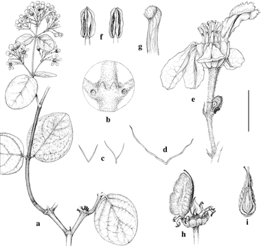 Mascagnia aptera. a. Flowering branch. b. Node showing interpetiolar stipules and glands at base of petioles. c. Hairs from adaxial surface of lamina. d. Hair from abaxial surface of lamina. e. Flower, posterior petal at upper right. f. Anthers, opposite a petal (left) and opposite a sepal (right). g. Distal portion of style. h. Fruit with two samaras removed. i. Samara, adaxial view. Scale bar equivalents: a, 4 cm; b, 4 mm; c, d, 0.6 mm; e, 4 mm; f, 1.6 mm; g, 0.7 mm; h, i, 5 mm. Based on Prance et al. 19274, MICH. Drawn by Karin Douthit. First published by W. R. Anderson in Contr. Univ. Michigan Herb. 14: 18. 1980.