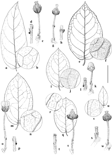 Mascagnia arenicola, M. australis, M. boliviana, M. riparia, M. tucuruensis, and M. velutina. a–d, M. riparia. a. Leaf. b. Detail of abaxial surface of lamina. c. Detail of inflorescence, showing an old flower with pedicel and peduncle. d. Peduncle with bracteoles. e–h, M. tucuruensis e. Leaf. f. Detail of abaxial surface of lamina. g. Detail of inflorescence, showing an old flower with pedicel and peduncle. h. Distal portion of peduncle with bracteoles. i–l, M. velutina. i. Leaf. j. Detail of abaxial surface of lamina. k. Detail of inflorescence, showing a flower bud with pedicel and peduncle. l. Distal portion of inflorescence with bracteoles. m–p, M. australis. m. Leaf. n. Detail of abaxial surface of lamina. o. Distal portion of inflorescence, showing an expanding flower with pedicel and peduncle. p. Distal portion of peduncle with bracteoles. q–t, M. arenicola. q. Leaf. r. Detail of abaxial surface of lamina. s. Detail of inflorescence, showing an old flower with pedicel and peduncle. t. Distal portion of peduncle with eglandular bracteoles. u–x, M. boliviana. u. Leaf. v. Detail of abaxial surface of lamina. w. Detail of inflorescence, showing an old flower with pedicel and peduncle. x. Peduncle with basal eglandular bracteoles and bract. Scale bar equivalents: a, e, i, m, q, u, 4 cm; b, d, f, h, j, l, n, p, r, t, v, x, 4 mm; c, g, k, o, s, w, 8 mm. Based on: a–d, Prance et al. 5289, MICH; e–h, Anderson 13749, MICH; i–l, Leoni 1970, MICH; m, Schulz 18387, MICH; n–p, Schulz 14299, MICH; q–t, Gillespie 1086, MICH; u–x, Saldías P. 582, MICH. Drawn by Karin Douthit. First published by C. Anderson in Brittonia 53: 407. 2001.