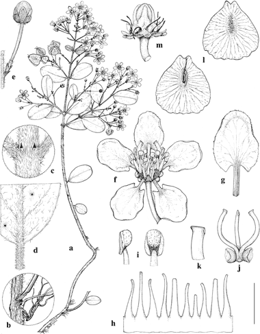 Mascagnia vacciniifolia. a. Flowering and fruiting branch. b. Adventitious roots on stem. c. Node to show interpetiolar stipules. d. Abaxial surface of leaf. e. Flower bud. f. Flower, posterior petal uppermost. g. Posterior petal, adaxial view. h. Androecium laid out, adaxial view, anthers removed, shortest filament opposite posterior petal. i. Anthers, side view (left) and abaxial view (right); j. Gynoecium, anterior style in center. k. Apex of posterior style. l. Samaras, abaxial view (above) and adaxial view (below). m. Torus after removal of mature samaras. Scale bar equivalents: a, 4 cm; b, 8 mm; c, 4 mm; d, 5 mm; e, 8 mm; f, 5 mm; g, 3.3 mm; h, 2.7 mm; i, 1.6 mm; j, 4 mm; k, 1.3 mm; l, 1.3 cm; m, 2 mm. Based on: a–k, Utley 5934, DUKE; l, m, Lent 2521, F. Drawn by Karin Douthit. First published by W. R. Anderson in Contr. Univ. Michigan Herb. 25: 103. 2007; reproduced with the author's permission.