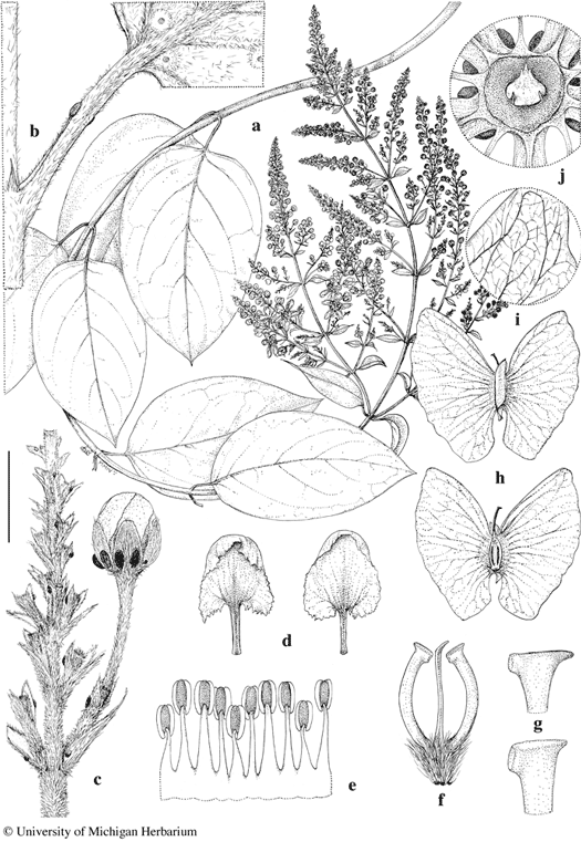 Mascagnia violacea. a. Flowering branch. b. Base of leaf, abaxial view, and node with stipule. c. Portion of inflorescence with one flower bud. d. Petals, adaxial view, posterior petal (left) and lateral petal (right). e. Androecium laid out, abaxial view, the stamen fifth from left opposite posterior petal. f. Gynoecium, anterior style in center. g. Distal portions of styles, anterior style (above) and posterior style (below). h. Samaras, abaxial view (above) and adaxial view (below). i. Venation in wing of samara. j. Old fruit after fall of samaras, from above, showing torus surrounded by lobed disc. Scale bar equivalents: a, 4 cm; b–e, 4 mm; f, 2.7 mm; g, 1 mm; h, 1.3 cm; i, 5 mm; j, 4 mm. Based on: a–g, García-Barriga 12178, US; h–j, Rusby & Pennell 103, US. Drawn by Karin Douthit. © University of Michigan Herbarium.