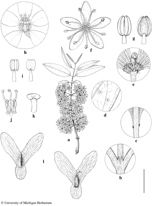 Microsteira ambovombensis. a. Flowering branch, staminate plant. b. Node with interpetiolar stipules. c. Biglandular petiole. d. Lamina, abaxial view to show glands in surface. e. Base of umbel. f. Staminate flower from above. g. Anthers from staminate flower, adaxial view (left) and abaxial view (right). h. Pistillate flower. i. Anthers from pistillate flower, adaxial view (left) and abaxial view (right). j. Gynoecium from pistillate flower. k. Apex of style. l. Samaras, abaxial view (left) and adaxial view (right).