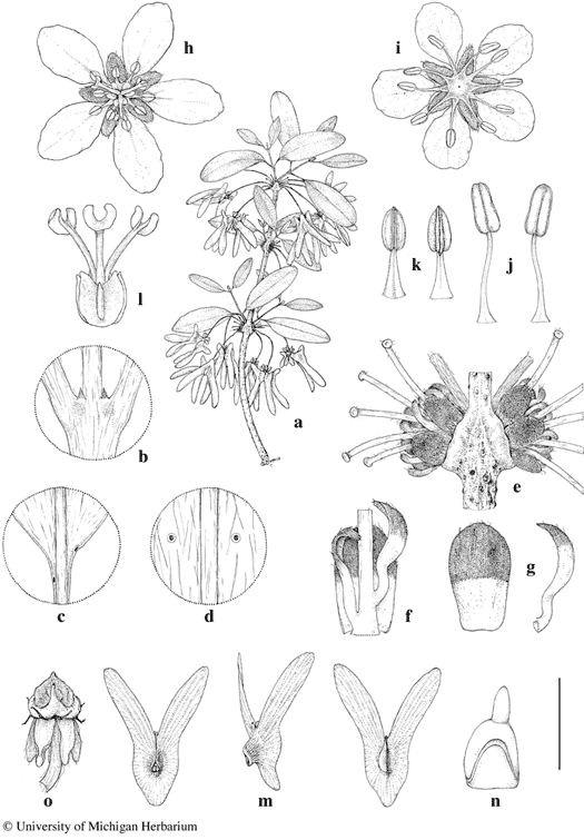 Scale bar equivalents: a, 4 cm; b, 2 mm; c, 4 mm; d, 2 mm; e, 4 mm; f, g, 2 mm; h, i, 5.7 mm; j–l, 2 mm; m, 1.3 cm; n, 2.7 mm; o, 4 mm. Based on: a–g, m–o, Miller & Keating 4515, MO; h, k, l, Perrier 5607, P; i, j, Service Forestier de Madagascar 26208, P. Drawn by Karin Douthit. © University of Michigan Herbarium.