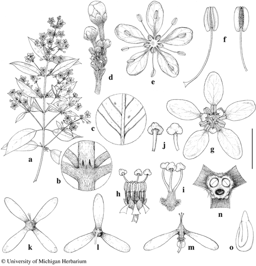 Rhynchophora humbertii. a. Branch with staminate flowers. b. Node with interpetiolar stipules. c. Base of lamina with glands, abaxial view. d. Buds of staminate flowers in inflorescence. e. Staminate flower from above. f. Stamens from staminate flower, adaxial view (left) and abaxial view (right). g. Pistillate flower from above. h. Pistillate flower, petals cut away, lateral view. i. Gynoecium from pistillate flower. j. Stigmas, abaxial view (left) and adaxial view (right). k. Four-winged fruit from above. l. Three-winged fruit from below. m. Three-winged fruit, lateral view. n. Cross-section of three-carpellate fruit (most of the wings cut away), showing two locules containing well-developed seeds and one with the seed abortive. o. Embryo.