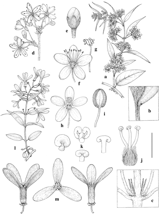 Scale bar equivalents: a, 4 cm; b, 4 mm; c, 8 mm; d, 1.3 cm; e, 4 mm; f, 8 mm; g, 1.3 mm; h, 8 mm; i, 1.3 mm; j, 2 mm; k, 0.67 mm; l, 4 cm; m, 1.3 cm. Based on: a–g, Phillipson et al. 3424, MO; h–m, Phillipson et al. 3451, MICH. Drawn by Karin Douthit. First published by W. R. Anderson in Contr. Univ. Michigan Herb. 23: 55. 2001.