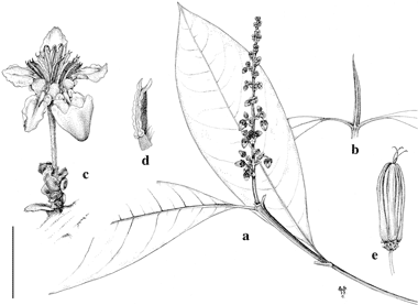 Glandonia prancei. a. Flowering branch. b. Node with stipules. c. Flower, posterior petal uppermost. d. Stamen. e. Fruit. Scale bar equivalents: a, 4 cm; b, 2 cm; c, 8 mm; d, 4 mm; e, 2 cm.—Based on: a, b, Prance et al. 8058, MICH; c, d, Prance et al. 3363, MICH; e, Prance et al. 20557, MICH. Drawn by Karin Douthit.—First published in Mem. New York Bot. Gard. 32: 46. 1981, modified and reproduced with permission of the author.