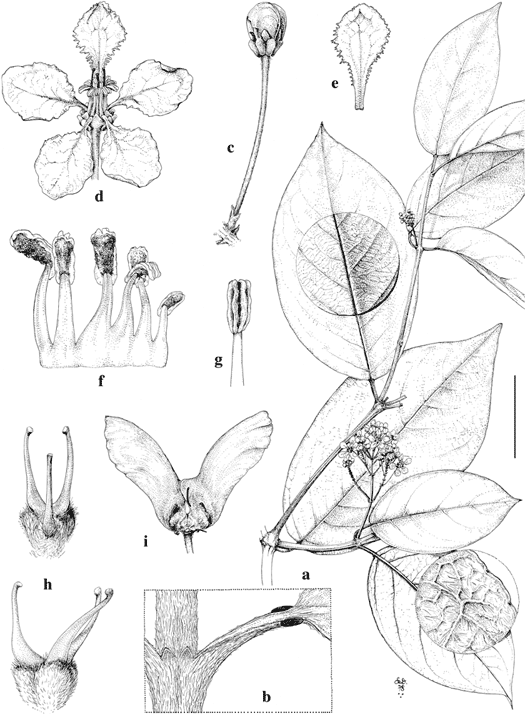 Bronwenia wurdackii. a. Flowering branch, with enlargement of adaxial surface of lamina (above) and abaxial surface showing tiny marginal glands (below). b. Node and base of leaf to show interpetiolar stipules and petiole glands. c. Flower bud. d. Flower, posterior petal uppermost. e. Posterior petal, adaxial view. f. Portion of androecium laid out, abaxial view, stamen to right opposite posterior petal. g. Anther, adaxial view. h. Gynoecium, with anterior style in middle (above) and with anterior style to left (below). i. Fruit with two samaras developed.