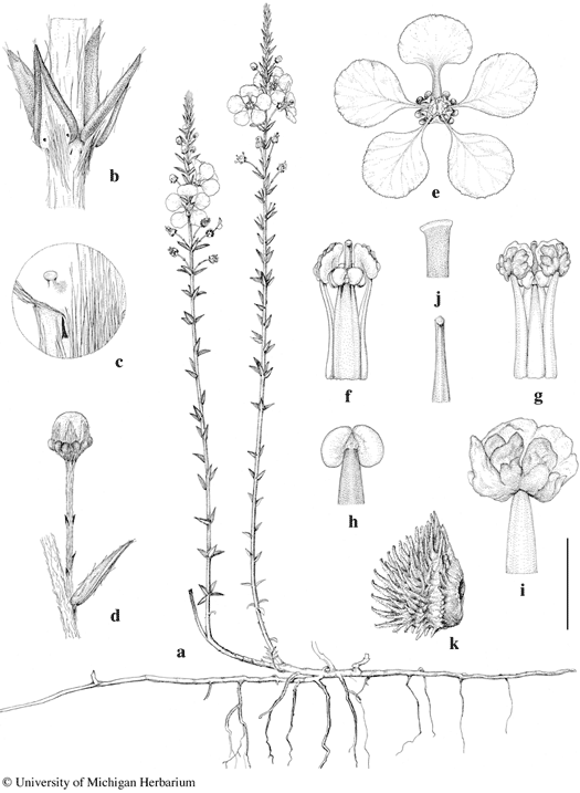 Camarea axillaris. a. Habit. b. Node with whorl of leaves. c. Abaxial base of leaf with stalked gland and adjacent stipule. d. Flower bud. e. Flower, posterior petal uppermost. f. Androecium from back with three connate fertile stamens flanked by two staminodes. g. Androecium from front with one fertile stamen flanked by two staminodes. h. Fertile anther, abaxial view. i. Staminode, abaxial view. j. Stigma from side (above) and from front (below). k. Mericarp, side view. Scale bar equivalents: a, 4 cm; b, 4 mm; c, 0.8 mm; d, 2 cm; e, 1 cm; f, g, 2.7 mm; h, i, 1.3 mm; j, 2 mm; k, 4 mm. Based on: a–j, Anderson 9102, MICH; k, Anderson 11580, MICH. Drawn by Karin Douthit. © University of Michigan Herbarium.