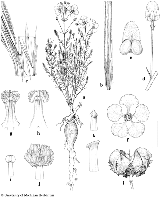 Scale bar equivalents: a, 4 cm; b, 1.3 mm; c, 0.8 mm; d, 8 mm; e, 2.7 mm; f, 1.3 cm; g, h, 4 mm; i, j, 2 mm; k, 1 mm; l, 4 mm. Based on: a–e, Irwin & Soderstrom 6948, NY; f–k, Heringer et al. 2168, NY; e, Goodland 224, NY. Drawn by Karin Douthit. © University of Michigan Herbarium.