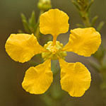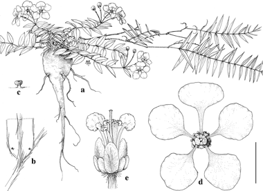 Camarea humifusa. a. Habit. b. Base of leaf, abaxial view. c. Leaf gland, side view. d. Flower, posterior petal uppermost. e. Flower with petals removed, side view with anterior sepal in front, stamens and staminodes bent apart. Scale bar equivalents: a, 4 cm; b, 4 mm; c, 0.8 mm; d, 8 mm; e, 4 mm. Based on Anderson 11465, MICH. Drawn by Karin Douthit. First published by W. R. Anderson in Contr. Univ. Michigan Herb. 19: 365. 1993.
