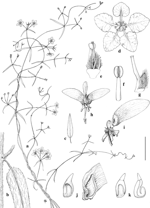Cottsia gracilis. a. Flowering branches. b. Base of leaf and adjacent stem to show stipule and marginal processes. c. Detached, relatively broad leaf. d. Flower, posterior petal uppermost. e. Androecium and gynoecium, with two fertile posterior stamens and three anterior staminodes. f. Fertile stamen, adaxial view. g. Anterior carpel. h. Fruit. i. Fruit base and torus with one samara attached by carpophore. j. Seed (left) and nut of samara in longitudinal section with seed removed (right). k. Embryos.