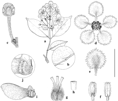 Diplopterys bahiana. a. Flowering branch. b. Enlargement of abaxial leaf surface to show minute marginal gland. c. Flower bud. d. Flower, posterior petal uppermost. e. Lateral petal, abaxial view. f. Anthers, abaxial view (left) and adaxial view (right). g. Gynoecium. h. Apex of style. i. Samara (most hairs removed from nut). j. Enlargement of nut of samara. Scale bar equivalents: a, 6 cm; b, 2 mm; c, 1 cm; d, 2 cm; e, 1.5 cm; f, g, 4 mm; h, 2 mm; i, 2 cm; j, 1 cm. Based on Hatschbach et al. 77886, MICH. Drawn by Karin Douthit. First published by W. R. Anderson & C. C. Davis in Harvard Pap. Bot. 11: 4. 2006.