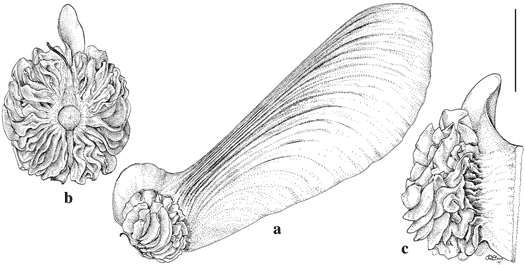 Diplopterys carvalhoi. a. Samara. b. Nut of samara from below, with ventral areole in center and carpophore below areole. c. Nut of samara from above, looking down dorsal wing. Scale bar equivlents: a, 2 cm; b, c, 1.3 cm. Based on Carvalho et al. 4118, MICH. Drawn by Karin Douthit. First published by W. R. Anderson & C. C. Davis in Harvard Pap. Bot. 11: 8. 2006.
