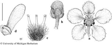 Diplopterys platyptera. a. Flower, posterior petal uppermost. b. Flower bud. c. Gynoecium, anterior style in center. d. Samara. Scale bar equivalents: a, 8 mm; b, 5.7 mm; c, 3.3 mm; d, 2.7 cm. Based on: a–c, Meier 2811, MICH; d, Burnham 2301, MICH. Drawn by Karin Douthit. © University of Michigan Herbarium.