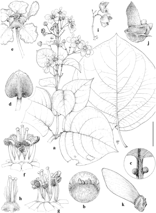 Diplopterys valvata. a. Flowering branch, and abaxial view of detached large leaf. b. Node with interpetiolar ridge bearing stipules. c. Apex of petiole, adaxial view, to show large glands. d. Flower bud. e. Flower, posterior petal to right. f. Androecium and gynoecium, view from behind with short stamen opposite posterior petal in foreground. g. Androecium and gynoecium, lateral view, posterior petal to left. h. Gynoecium. i. Enlarging fruits enclosed by accrescent sepals. j. Immature fruit. k. Samara. Scale bar equivalents: a, 4 cm; b, c, 4 mm; d, 8 mm; e, 1.3 cm; f–h, 4 mm; i, 4 cm; j, 1.3 cm; k, 2 cm. Based on: a–j, Anderson et al. 36981, MICH; k, Harley 21676, MICH. Drawn by Karin Douthit. Modified from a drawing first published by W. R. Anderson in Contr. Univ. Michigan Herb. 11: 52. 1975.
