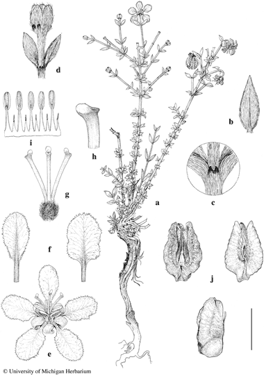 Gallardoa fischeri. a. Habit. b. Detached leaf, abaxial view. c. Node with interpetiolar stipules. d. Flower bud. e. Flower, posterior petal uppermost. f. Detached petals, abaxial view, posterior petal (left) and posterior-lateral petal (right). g. Gynoecium. h. Distal portion of style. i. Androecium laid out, abaxial view, fertile stamens opposite petals. j. Mericarps, abaxial view (left), adaxial view (right), side view (below). Scale bar equivalents: a, 4 cm; b, 8 mm; c, 4 mm; d, 8 mm; e, 1 cm; f, 6.7 mm; g, 5 mm; h, 2 mm; i, 6.7 mm; j, 1 cm. Based on: a–d, Cabrera 18633, MO; e, g–i, Krapovickas et al. 22477, CTES; f, Krapovickas et al. 22435, CTES; j, Fischer 10, GH. Drawn by Karin Douthit. © University of Michigan Herbarium.