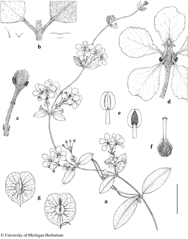 Gaudichaudiana arnottiana. a. Flowering branch. b. Base of pair of leaves, with enlarged hairs from adaxial surface (left) and abaxial surface (right). c. Bud of chasmogamous flower. d. Chasmogamous flower, posterior petal uppermost. e. Anthers, adaxial view (left) and abaxial view (right). f. Gynoecium. g. Samaras, abaxial view (left) and adaxial view (right). Scale bar equivalents: a, 4 cm; b, 8 mm (hairs 2.7 mm); c, 5 mm; d, 8 mm; e, 2 mm; f, 4 mm; g, 1.3 cm. Based on: a–f, Mexia 1697, CAS; g, Beechey s.n., K. Drawn by Karin Douthit. © University of Michigan Herbarium.