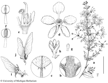 Gaudichaudia diandra. a. Branch with chasmogamous flowers and fruits from cleistogamous flowers. b. Node to show stipules; hairs removed to reveal stipules. c. Base of lamina. d. Chasmogamous flower, posterior petal uppermost. e. Androecium and gynoecium of chasmogamous flower; claw of posterior petal at left, anterior sepal at right. f. Anthers from chasmogamous flower, adaxial view (above) and abaxial view (below). g. Cleistogamous flower at time of fertilization. h. Cleistigamous flower with enlarging samaras (note single stamen in center). i. Samara from posterior-lateral carpel, adaxial view, still attached to receptacle of cleistogamous flower by carpophore. j. Samara from anterior carpel of chasmogamous flower, abaxial view. Scale bar equivalents: a, 4 cm; b, 2 mm; c, 4 mm; d, 8 mm; e, 4 mm; f, 2 mm; g–j, 8 mm. Based on Anderson & Laskowski 3709, MICH. Drawn by Karin Douthit. © University of Michigan Herbarium.