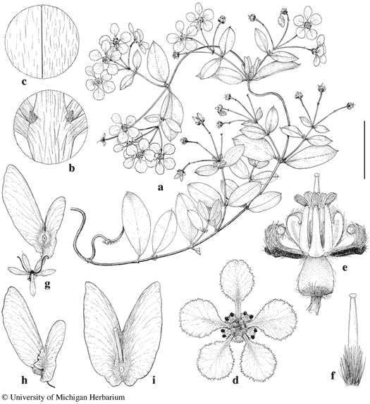 Gaudichaudia hexandra. a. Flowering branch. b. Node with interpetiolar stipules. c. Enlargement of adaxial (left) and abaxial (right) surfaces of lamina, to show straight appressed hairs. d. Flower, posterior petal uppermost. e. Flower with petals removed, side view, anterior sepal bent down. f. Gynoecium. g. Samara of cleistogamous flower, adaxial view, still attached to torus by carpophore. h. Samara of cleistogamous flower, abaxial view. i. Samara from anterior carpel of chasmogamous flower.