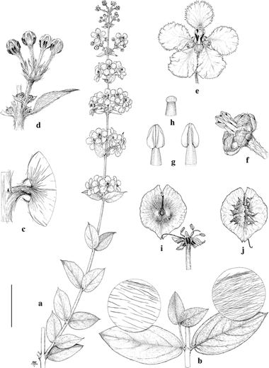 Gaudichaudia krusei. a. Flowering branch. b. Large leaves, with enlargements of adaxial surface (left) and abaxial surface (right). c. Base of leaf and node with interpetiolar stipule. d. Umbel in bud. e. Flower, posterior petal uppermost. f. Flower with petals removed, lateral view. g. Anthers, adaxial view (left) and abaxial view (right). h. Stigma. i. Samara, adaxial view, still attached to receptacle by carpophore. j. Samara, abaxial view. Scale bar equivalents: a, 4 cm; b, 4 cm (4 mm); c, 4 mm; d, e, 8 mm; f, 5 mm; g, 2 mm; h, 0.8 mm; i, j, 8 mm. Based on: a–h, Anderson 12868, MICH; i, j, Koch & Fryxell 8264, MICH. Drawn by Karin Douthit. First published by W. R. Anderson in Contr. Univ. Michigan Herb. 16: 70. 1987.