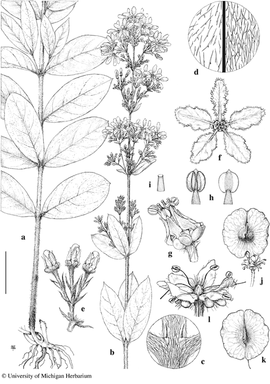 Scale bar equivalents: a, b, 4 cm; c, d, 4 mm; e, 8 mm; f, 1 cm; g, 4 mm; h, i, 2 mm; j, k, 1.3 cm; l, 5 mm. Based on: a, b, d–i, Anderson & Anderson 5104, MICH; c, Wilbur & Wilbur 2306, MICH; j–l, Feddema 1416, MICH. Drawn by Karin Douthit. © University of Michigan Herbarium.