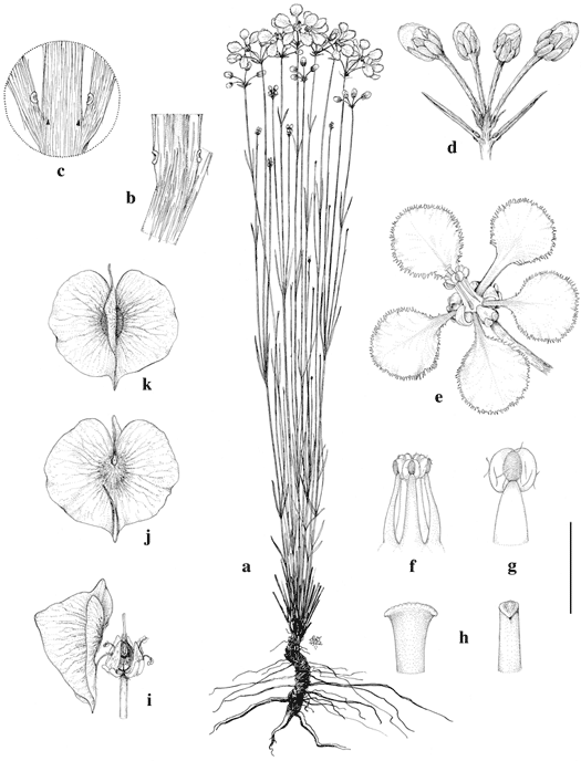 Janusia linearifolia. a. Flowering habit. b. Base of leaf, abaxial view. c. Node showing minute stipules on stem beside leaves (some hairs removed). d. Umbel of four flower buds. e. Flower, posterior petal at upper right. f. Androecium. g. Anther, abaxial view. h. Stigma, lateral view (left) and anterior view (right). i. Samara, lateral view, still attached to receptacle by carpophore. j. Samara, adaxial view. k. Samara, abaxial view.