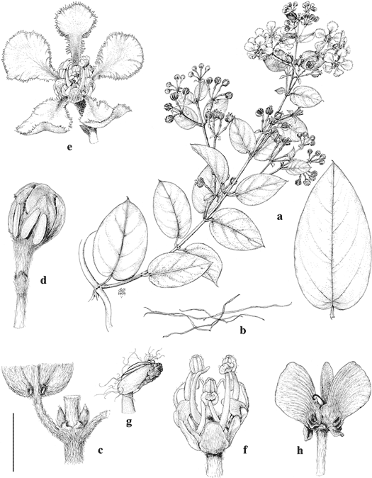 Scale bar equivalents: a, 4 cm; b, 0.8 mm; c, 8 mm; d, 5.7 mm; e, 1 cm; f, 5 mm; g, 1.3 mm; h, 1.3 cm. Based on Anderson 11151, MICH, except detached large leaf, from Hatschbach 21590, MICH. Drawn by Karin Douthit. First published by W. R. Anderson in Contr. Univ. Michigan Herb. 16: 85. 1987.