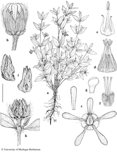 Mionandra camareoides. a. Habit. b. Opening flower bud showing separation of valvate sepals. c. Flower, posterior petal uppermost, and detached posterior petal. d. Complete androecium, abaxial view. e. Partial androecium, abaxial view, the fertile stamen opposite posterior petal. f. Gynoecium. g. Stigmatic apex of a style. h. Fruit with sepal in foreground cut away. i. Mericarps, adaxial view (right) and lateral view (left). Scale bar equivalents: a, 4 cm; b, 4 mm; c, 5.7 mm; d, 2 mm; e, 1.8 mm; f, 2 mm; g, 0.4 mm; h, 8 mm; i, 5.7 mm. Based on: a, c, f, g, Venturi 7519, US; b, d, e, Venturi 5770, US; h, i, Anderson 13585, MICH. Drawn by Karin Douthit. © University of Michigan Herbarium.