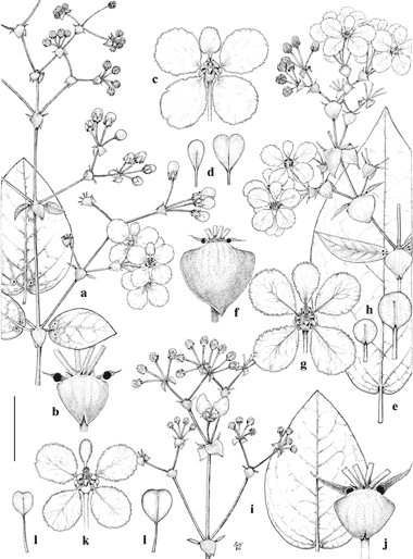 Peixotoa spinensis, P. leptoclada, and P. barnebyi. a–d, P. spinensis. a. Flowering branch and stem leaf. b. Base of a distal umbel. c. Flower, posterior petal uppermost. d. Staminode glands, posterior-lateral (left) and anterior (right). e–h, P. leptoclada. e. Flowering branch and stem leaf. f. Base of a distal umbel. g. Flower, posterior petal uppermost. h. Staminode glands, posterior-lateral (left) and anterior (right). i–l, P. barnebyi. i. Flowering branch and stem leaf. j. Base of a distal umbel. k. Flower, posterior petal uppermost. l. Staminode glands, posterior-lateral (left) and anterior (right). Scale bar equivalents: a, 4 cm; b, 8 mm; c, 2 cm; d, 2.7 mm; e, 4 cm; f, 8 mm; g, 2 cm; h, 2.7 mm; i, 4 cm; j, 8 mm; k, 2 cm; l, 2.7 mm. Based on: a–d, Anderson 8730, MICH; e–h, Pohl 2946, NY; i–l, Anderson 8623, MICH. Drawn by Karin Douthit. First published by C. Anderson in Contr. Univ. Michigan Herb. 15: 85. 1982.