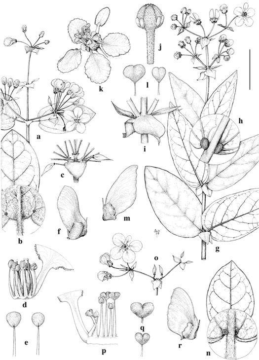 Peixotoa catarinensis, P. glabra, and P. hispidula. a–f, P. catarinensis: a. Flowering branch and stem leaf. b. Base of lamina, abaxial view. c. Base of a distal umbel. d. Androecium and gynoecium with base of posterior petal. e. Staminodes, adaxial view, anterior (left) and posterior-lateral (right). f. Samara. g–m, P. glabra: g. Flowering branch. h. Base of lamina, abaxial view. i. Base of a distal umbel. j. Flower bud. k. Flower, posterior petal uppermost. l. Staminode glands, adaxial view, anterior (left) and posterior-lateral (right); m, samara. n–r, P. hispidula: n. Stem leaf, with base of lamina enlarged, abaxial view. o. Tip of flowering branch. p. Partial androecium laid out, abaxial view, with base of posterior petal to left. q. Staminode glands, adaxial view, anterior (above) and posterior-lateral (below). r. Samara. Scale bar equivalents: a, 4 cm; b, 8 mm; c, 1.3 cm; d, 5.7 mm; e, 2.7 mm; f, 2 cm; g, 4 cm; h, 8 mm; i, 1.3 cm; j, 8 mm; k, 1.3 cm; l, 2.7 mm; m, 2 cm; n, 4 cm (8 mm); o, 4 cm; p, 5.7 mm; q, 2.7 mm; r, 2 cm. Based on: a, c–f, Smith & Reitz 12276, US; b, Smith 3240, US; g–i, k, l, Irwin et al. 28371, MICH; j, Anderson 11549, MICH; m, Irwin et al. 28412, MICH; n–q, Harley et al. 18510, MICH; p, Araujo 140, MICH. Drawn by Karin Douthit. Modified from a drawing first published by C. Anderson in Contr. Univ. Michigan Herb. 15: 86. 1982.