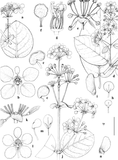 Peixotoa cipoana, P. parviflora, and P. tomentosa. a–c, P. cipoana. a. Flowering branch and stem leaf. b. Flower, posterior petal uppermost. c. Staminode glands, lateral view, anterior (above) and posterior-lateral (below). d–i, P. parviflora. d. Flowering branch and stem leaf. e. Base of a distal umbel. f. Posterior petal. g. Androecium and gynoecium, with posterior styles to left. h. Staminode glands, adaxial view, anterior (above) and posterior-lateral (below). i. Samara. j–n, P. tomentosa. j. Flowering branch. k. Base of a distal umbel. l. Flower, posterior petal uppermost. m. Staminode glands, posterior-lateral (left, lateral view) and anterior (right, adaxial view). n. Samara. Scale bar equivalents: a, 4 cm; b, 1.3 cm; c, 2 mm; d, 4 cm; e, 1.3 cm; f, 5.7 mm; g, 2.7 mm; h, 2 mm; i, 2.7 cm; j, 4 cm; k, 8 mm; l, 1.3 cm; m, 2 mm; n, 2.7 cm. Based on: a, Atala 62, R; b, c, Vidal s.n., R108249; d, flowering branch from Dusén 9225, US, leaf from Widgren s.n., US; e, Glaziou 10371, US; f–h, Sucre 7560, MICH; i, Widgren s.n., US; j, Langsdorff s.n., LE; k, Irwin et al. 28236a, MICH; l, m, Eiten & Eiten 11072, MICH; n, Maguire 44770, MICH. Drawn by Karin Douthit. First published by C. Anderson in Contr. Univ. Michigan Herb. 15: 87. 1982.