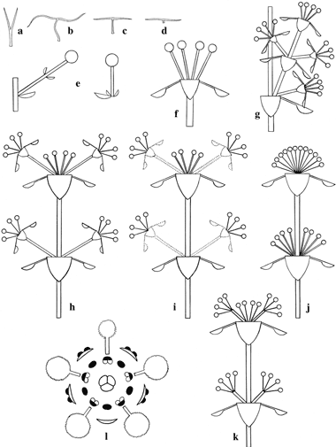Morphology of Peixotoa. a–d. Hairs representative of four types of vesture: a, velutinous; b, tomentose; c, “pubescent with T-shaped hairs”; d, sericeous. e. Hypothetical transition from pedunculate to sessile flower. f. Typical umbel subtended by a pair of leaves and two pairs of connate interpetiolar stipules (only one pair of stipules visible). g. “Subsidiary axis” located between the secondary axis and the leaf. h–k. Transition from 4-flowered (1-umbellate) terminal node to 12-flowered (3-umbellate) terminal node: h, all umbels 4-flowered, each umbel subtended by a pair of leaves and connate stipules; i, j, suppression of secondary axes accompanied by loss of leaves and stipules, the terminal node 12-flowered, the lateral nodes with a sessile umbel in each leaf axil; k, variation of condition in (j), with lateral umbels borne on secondary peduncles but not subtended by leaves and stipules. l. Floral diagram. First published by C. Anderson in Contr. Univ. Michigan Herb. 15: 4. 1982.