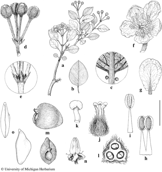 Scale bar equivalents: a, b, 4 cm; c, 4 mm; d, 1 cm; e, 6.7 mm; f, 8 mm; g, 5.7 mm; h–j, 2.7 mm; k, 1 mm; l, 1.3 mm; m, n, 1.6 cm; o, 8 mm. Based on: a, c–l, Dorr & Rakotozafy 4519, MO; b, Barnett 499, MO; m–o, Lowry & Schatz 4825, MICH. Drawn by Karin Douthit. © University of Michigan Herbarium.