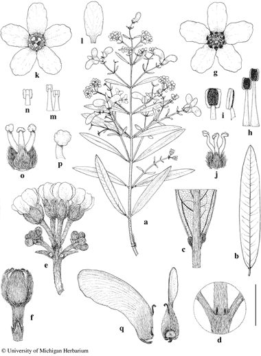 Sphedamnocarpus andersonii. a. Branch with flowers and fruits. b. Detached large leaf, abaxial view. c. Base of lamina, abaxial view. d. Node with interpetiolar stipules. e. Umbel of four flowers just opening, subtended by very young lateral umbels. f. Flower bud about to open, subtended by the bract and two bracteoles. g. Staminate flower from above. h. Two stamens from staminate flower, abaxial view, that on right opposite a sepal, that on left opposite a petal. i. Anthers from staminate flower, abaxial view (left) and lateral view (right). j. Gynoecium from staminate flower. k. Pistillate flower from above. l. Petal from pistillate flower, adaxial view. m. Two stamens from pistillate flower, abaxial view, that on left opposite a sepal, that on right opposite a petal. n. Anther from pistillate flower. o. Gynoecium from pistillate flower. p. Apex of style from gynoecium of pistillate flower. q. Samaras, lateral view (left) and adaxial view (right). Scale bar equivalents: a, b, 4 cm; c, d, 4 mm; e, 5.7 mm; f, 2.7 mm; g, 4 mm; h, 2 mm; i, 1.3 mm; j, 2 mm; k, l, 4 mm; m, 2 mm; n, 1.3 mm; o, 2 mm; p, 1 mm; q, 8 mm. Based on: a, c, d, k–q, Daniel 11025 (MICH); b, Labat et al. 2126 (MO); e–j, Phillipson 4104 (MICH). Drawn by Karin Douthit. First published in Brittonia 70: 249. 2018; reproduced with the author's permission.
