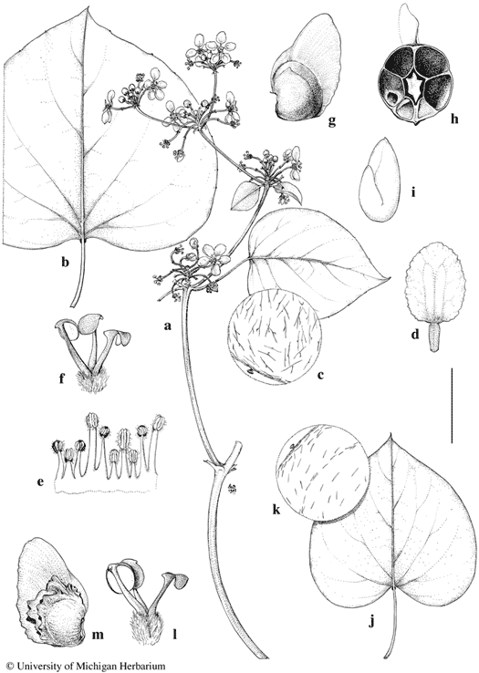 Scale bar equivalents: a, b, 4 cm; c, 4 mm; d, 8 mm; e, f, 5.7 mm; g, 2 cm; h, 1 cm; i, 8 mm; j, 4 cm; k, 4 mm; l, 5.7 mm; m, 2 cm. Based on: a, c, Klug 1740; b, Mexia 6329; d–f, Wurdack 2239; g–i, Prance 24617; j–l, Schunke V. 49; m, Ayala et al. 2618. Drawn by Karin Douthit. First published by C. Anderson in Syst. Bot. Monogr. 51: 100. 1997. © University of Michigan Herbarium.