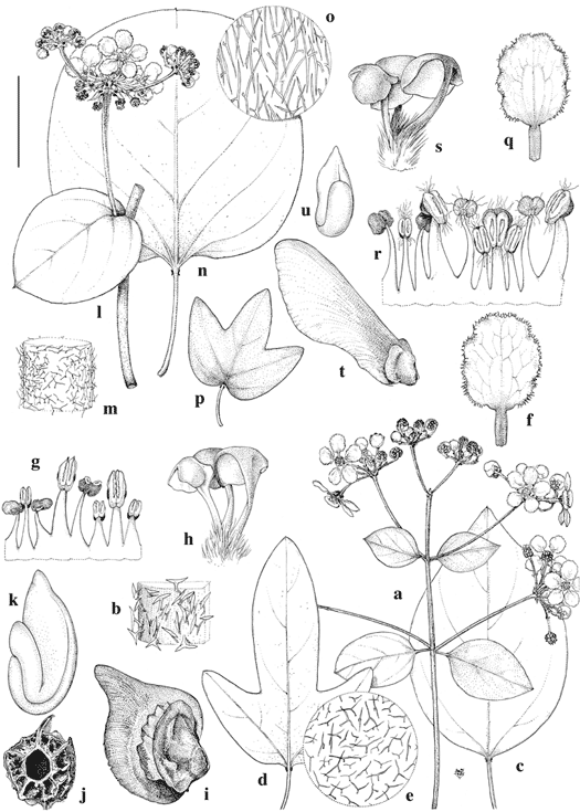 l–u, S. gayanum. l. Flowering branch. m. Detail of stem showing pubescence. n. Large leaf with unlobed lamina. o. Detail of abaxial surface of lamina. p. Leaf with lobed lamina. q. Posterior petal. r. Androecium laid flat, adaxial view, stamen second from left opposing the posterior petal. s. Gynoecium, anterior style to the left. t. Samara. u. Embryo.