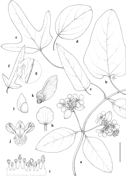 Stigmaphyllon arenicola. a. Flowering branch. b–f. Leaves illustrating variation of laminar shape. g. Detail of margin and abaxial surface of lamina. h. Posterior petal. i. Androecium laid flat, adaxial view, stamen second from left opposing posterior petal. j. Gynoecium; posterior styles are bent slightly outward to show anterior style (in center). k. Samara. l. Embryo.