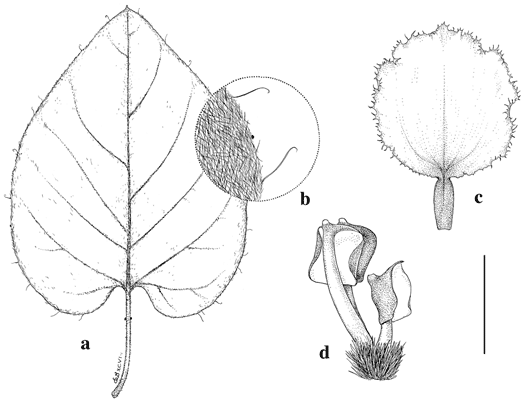 Stigmaphyllon boliviense. a. Large leaf. b. Detail of margin and abaxial surface of lamina. c. Posterior petal. d. Gynoecium, anterior style to the right. Scale bar equivalents: a, 4 cm; b, 8 mm; c, 6.7 mm; d, 3.3 mm. Based on Jardim 1901. Drawn by Karin Douthit. First published by C. Anderson in Syst. Bot. Monogr. 51: 181. 1997.