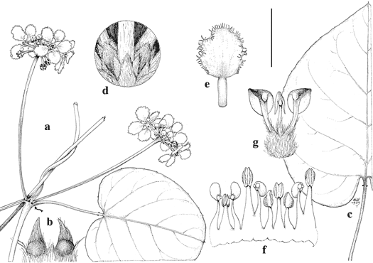 Stigmaphyllon bradei. a. Flowering branch. b. Enlargement of stipules. c. Large leaf. d. Detail of base of umbel; the peduncle is rudimentary and thus the base of each pedicel is hidden by two bracteoles and one bract. e. Posterior petal. f. Androecium laid flat, adaxial view, stamen second from left opposing the posterior petal. g. Gynoecium; posterior styles are bent slightly outward to show anterior style (in center). Scale bar equivalents: a, 4 cm; b, 4 mm; c, 4 cm; d, 4 mm; e, 8 mm; f, g, 4 mm. Based on: a, b, d–g, Moura s.n. SP123438; c, Brade 7987. Drawn by Karin Douthit. First published by C. Anderson in Contr. Univ. Michigan Herb. 17: 8. 1990.