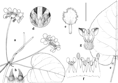 Stigmaphyllon bradei. a. Flowering branch. b. Enlargement of stipules. c. Large leaf. d. Detail of base of umbel; the peduncle is rudimentary and thus the base of each pedicel is hidden by two bracteoles and one bract. e. Posterior petal. f. Androecium laid flat, adaxial view, stamen second from left opposing the posterior petal. g. Gynoecium; posterior styles are bent slightly outward to show anterior style (in center). Scale bar equivalents: a, 4 cm; b, 4 mm; c, 4 cm; d, 4 mm; e, 8 mm; f, g, 4 mm. Based on: a, b, d–g, Moura s.n. SP123438; c, Brade 7987. Drawn by Karin Douthit. First published by C. Anderson in Contr. Univ. Michigan Herb. 17: 8. 1990.